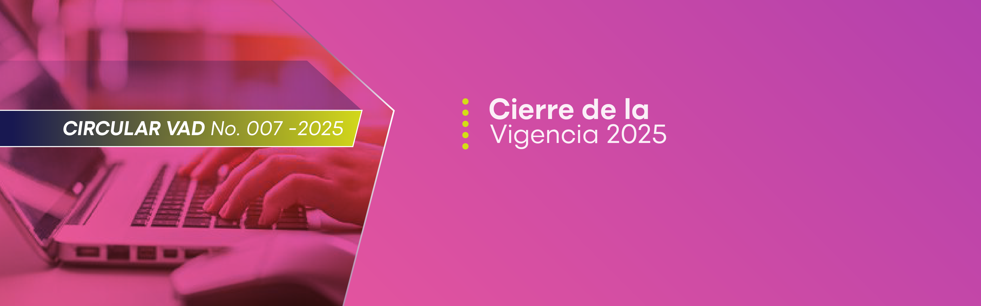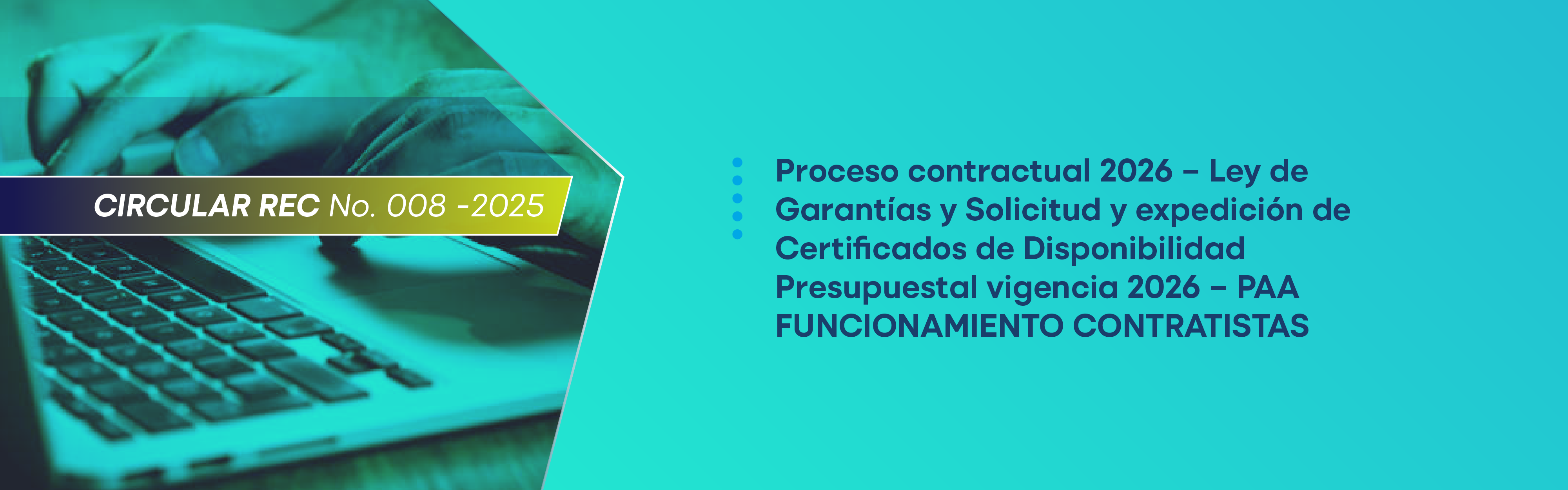La Subdirección Financiera informa a la comunidad universitaria que a partir del día 05 de noviembre del 2025, se encuentra publica en el portal web la Circular REC No. 008 del 2025: Proceso contractual 2026 – Ley de Garantías y Solicitud y expedición de Certificados de Disponibilidad Presupuestal vigencia 2026 – PAA FUNCIONAMIENTO CONTRATISTAS.